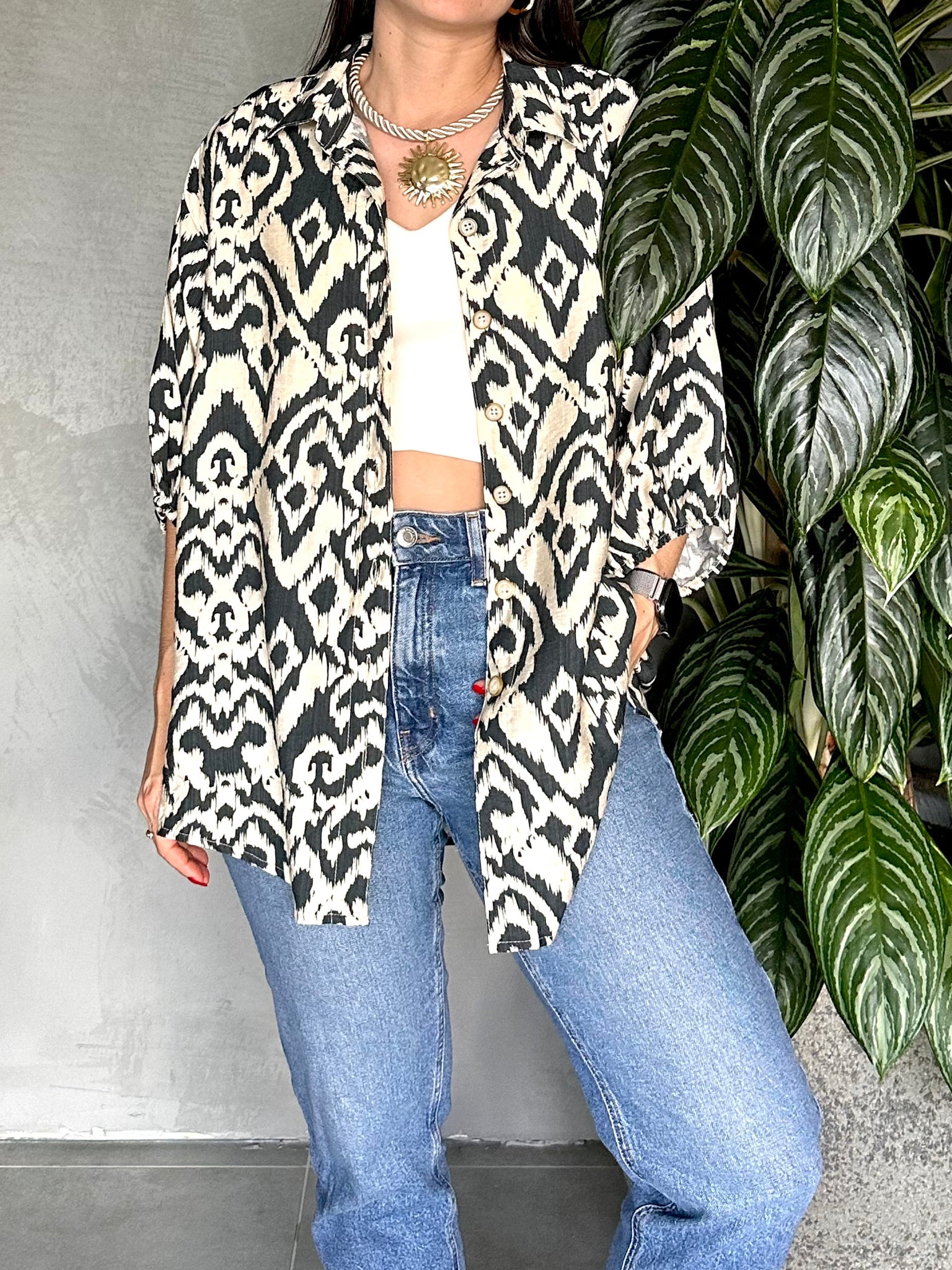 Camisa oversized con cuello y botones. Mangas 3/4 con elástico en puños.
