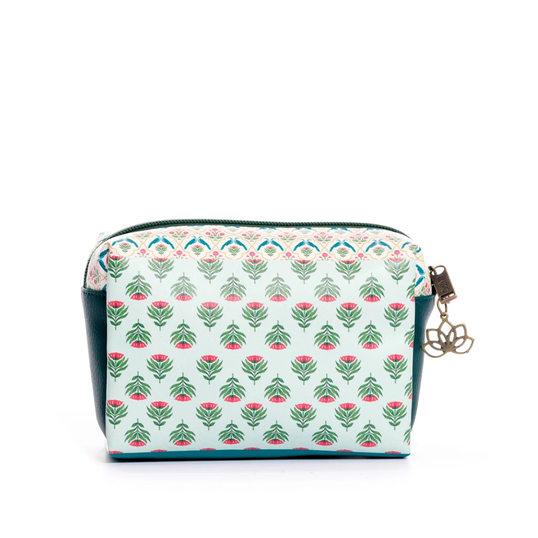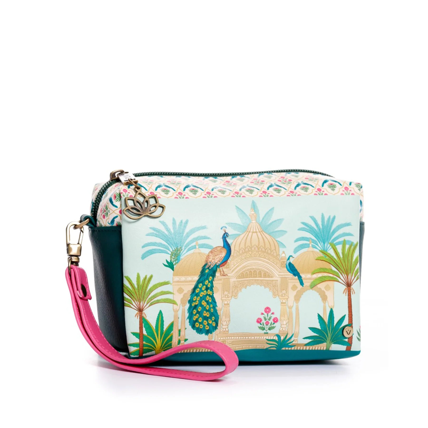 Inspirada en la arquitectura majestuosa y los jardines de la India, esta cosmetiquera es un homenaje a la belleza que florece en cada rincón. Perfecta para llevar lo esencial, con diseño colorido y detalle de dije en forma de flor de loto que le aporta un toque especial. Incluye manija removible en contraste.