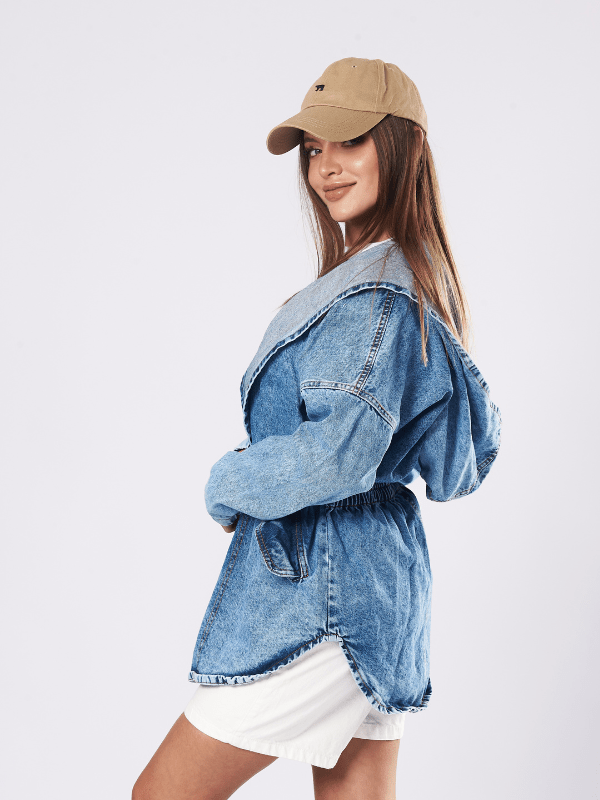 Chompa en denim sin rotos, bolsillos , detalle de amarre y recogido a nivel de la cintura parte trasera.