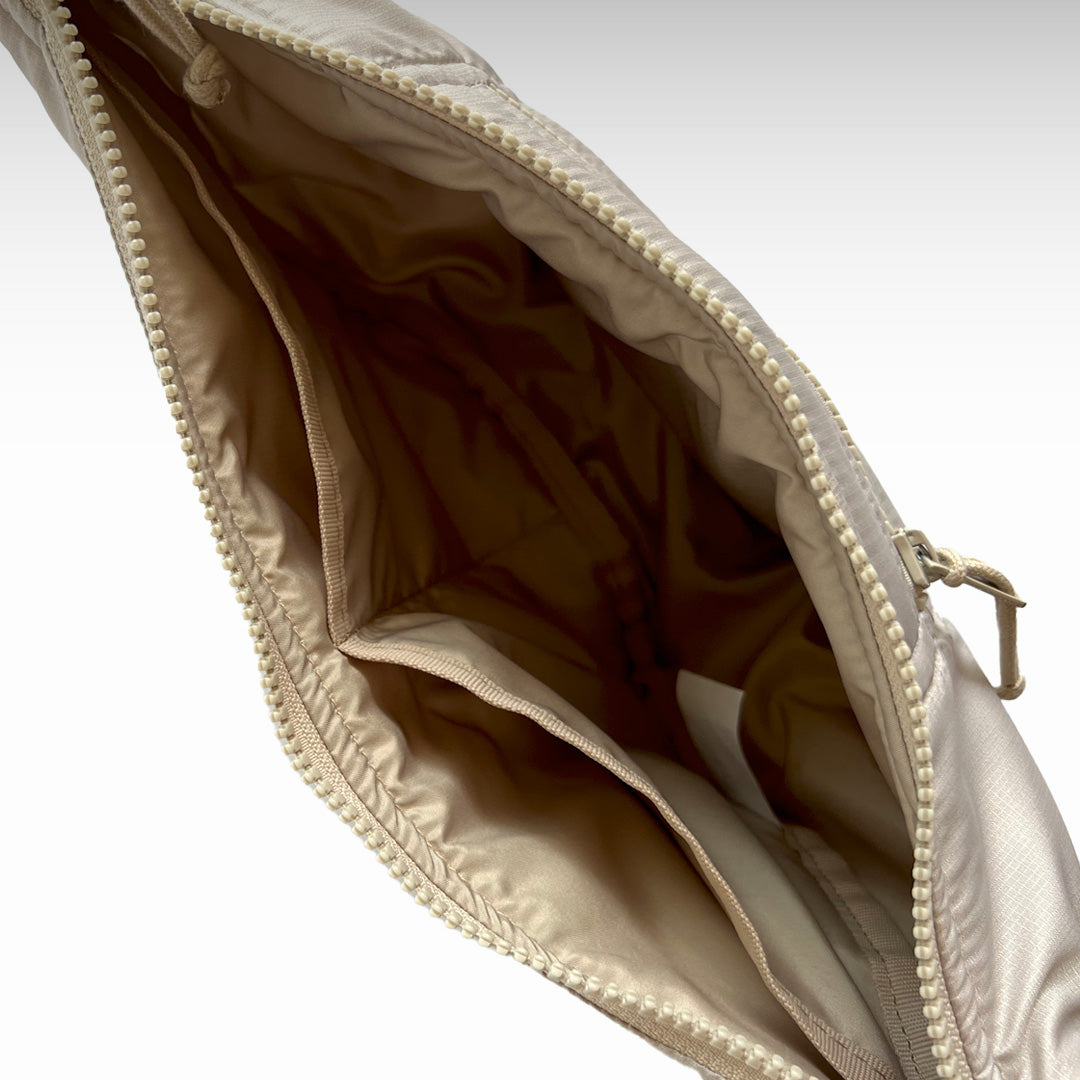 Bolso tipo banana acolchada en tela con textura en cuadritos fabricado en lona antifluido.