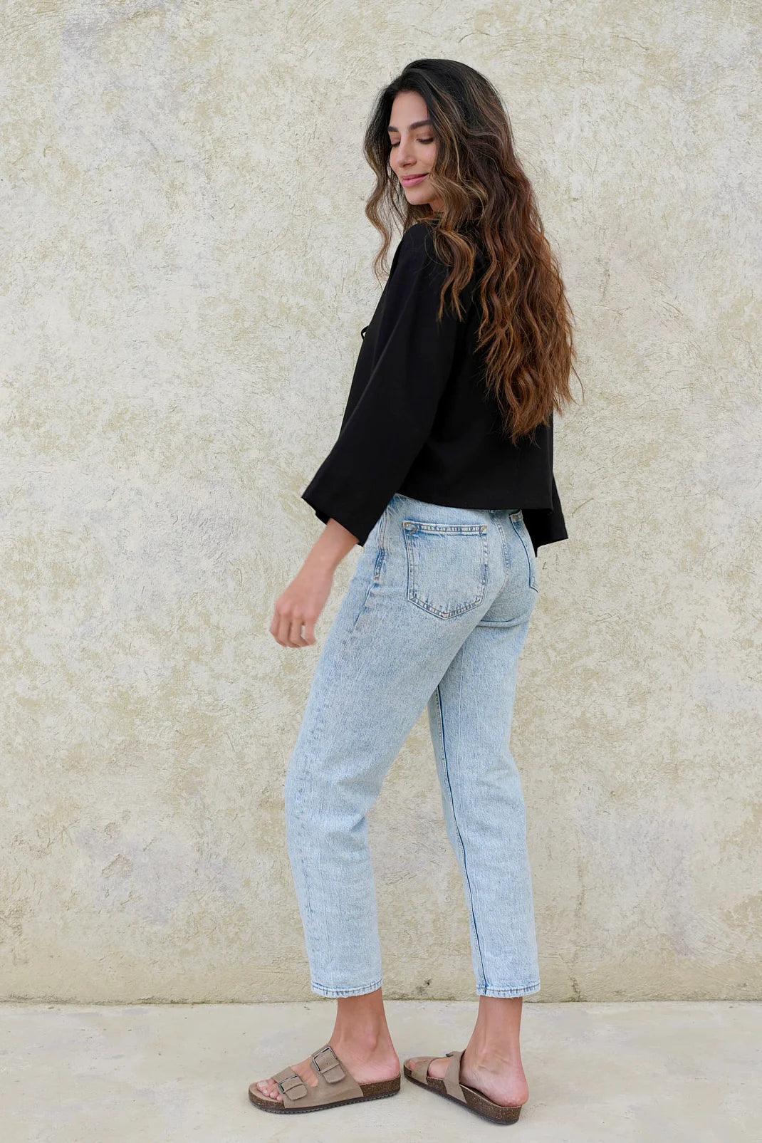 Blusa negra manga midi ancha con escote en V, en tela rayón tipo lino, ajustable al frente con dos delicados lazos del mismo tejido.